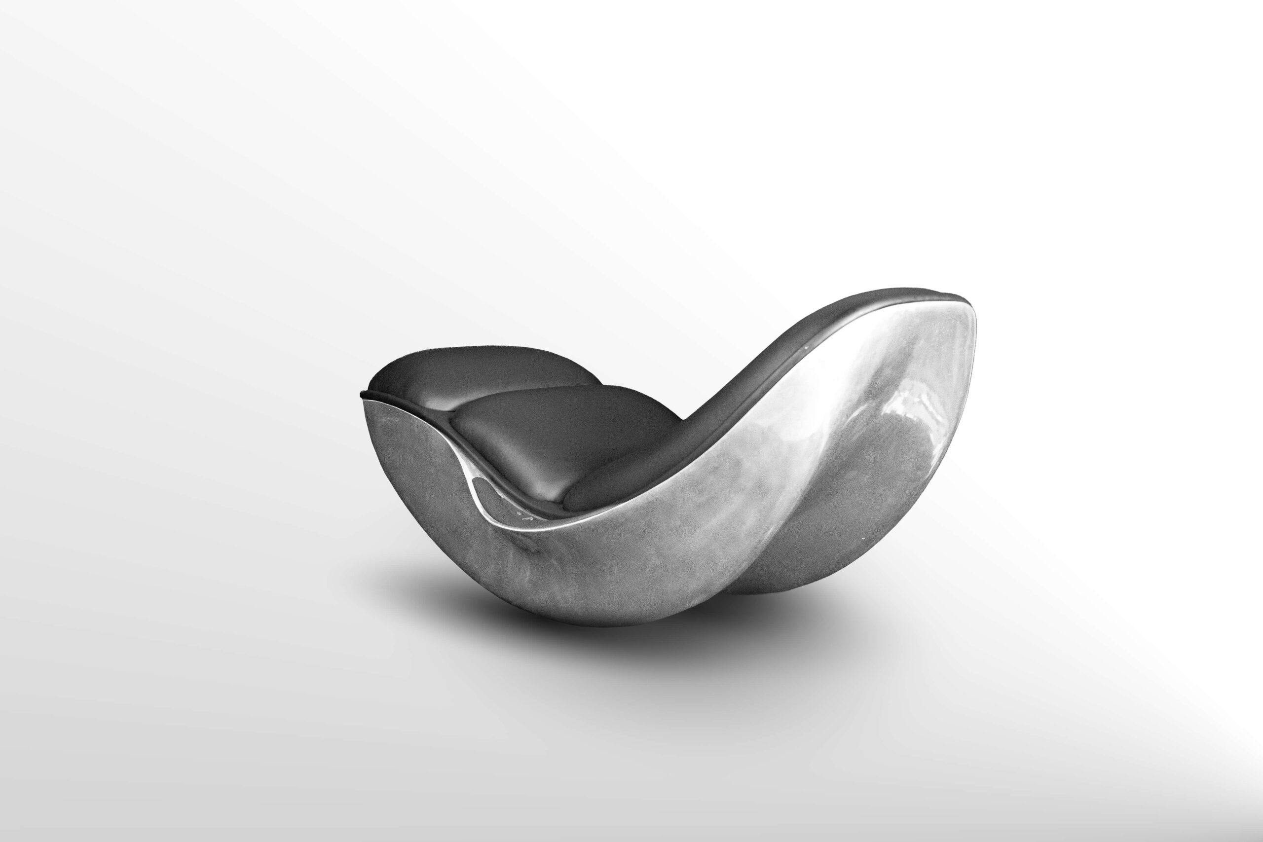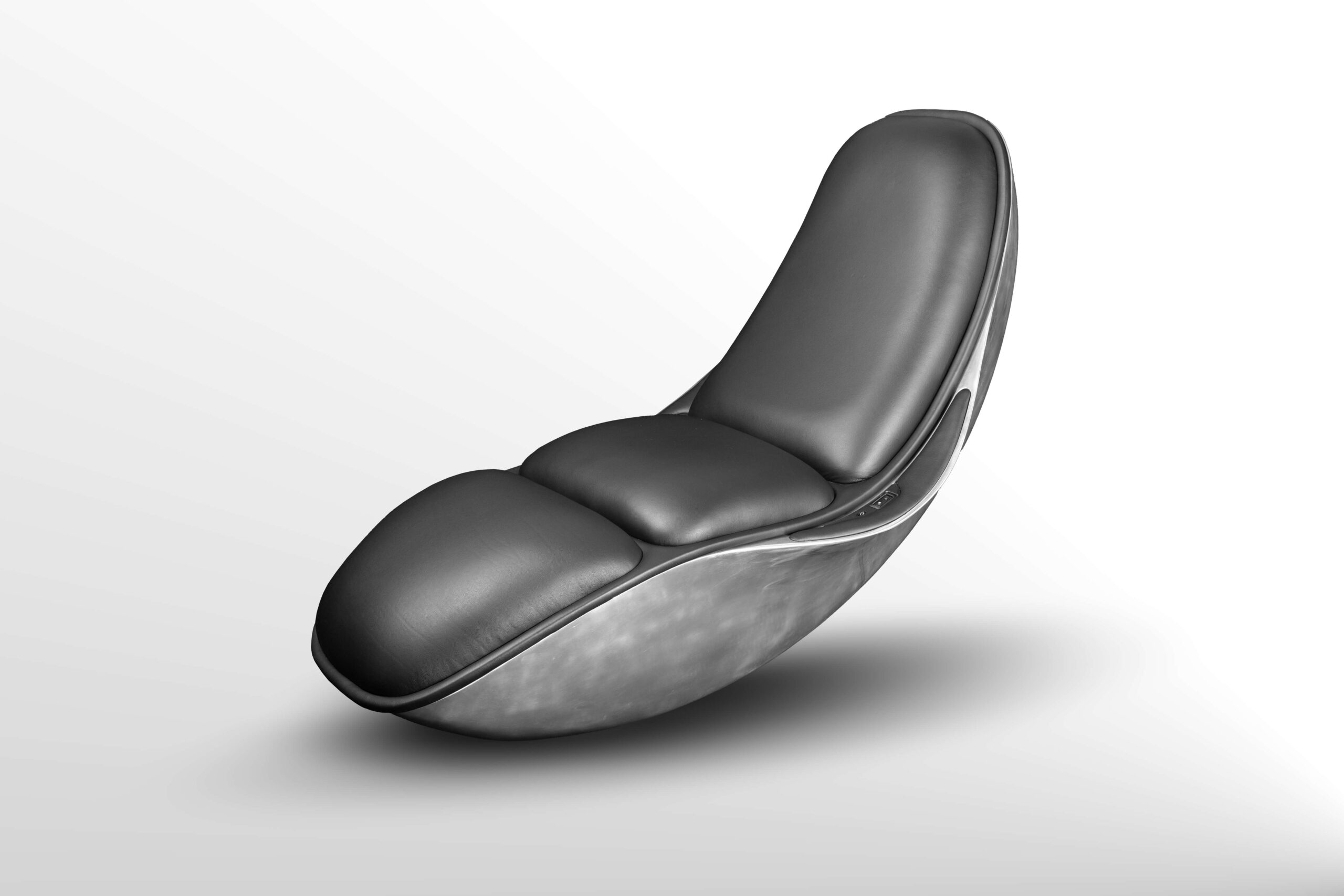 Its aluminum shell conceals a hidden mechanism that enables fluid, continuous postures, transforming rocking into an experience of suspended gravity.