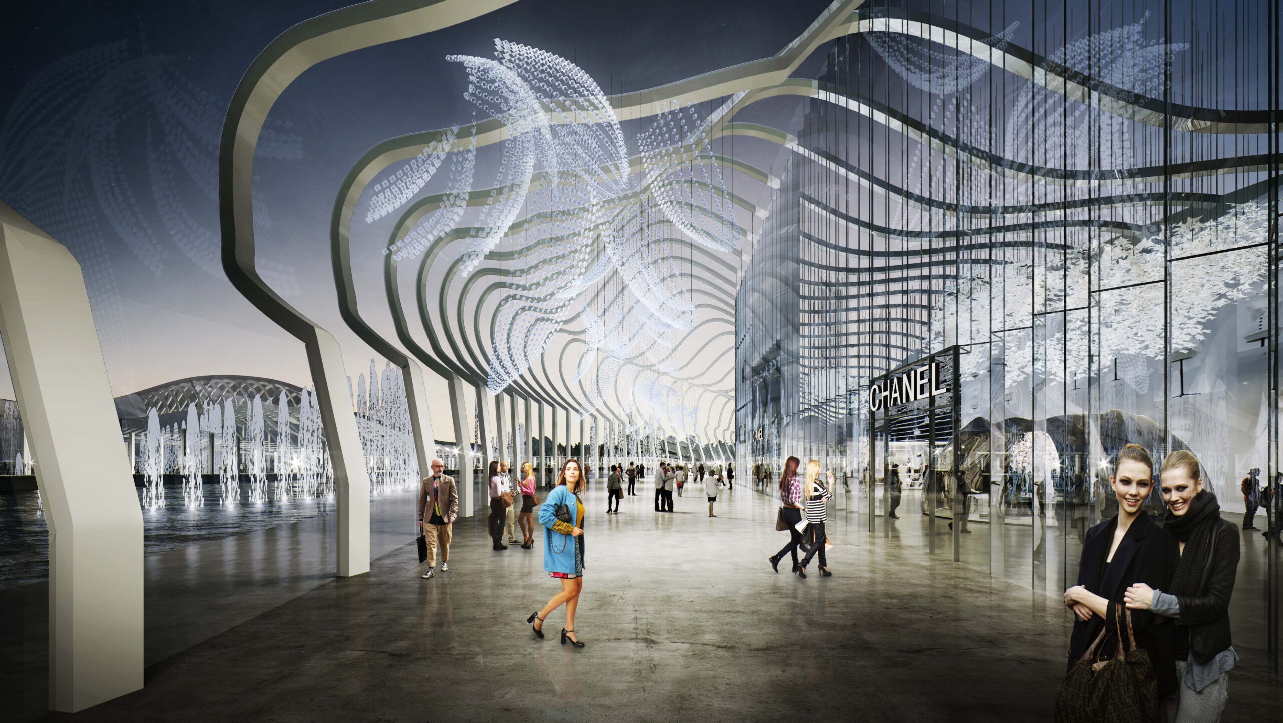 The island features expansive spaces for fashion shows, with sweeping arcs and adaptable canopies, hosting everything from grand runways to intimate couture showcases. Surrounding these are seamlessly integrated retail zones, offering a curated shopping experience amidst avant-garde architecture.
